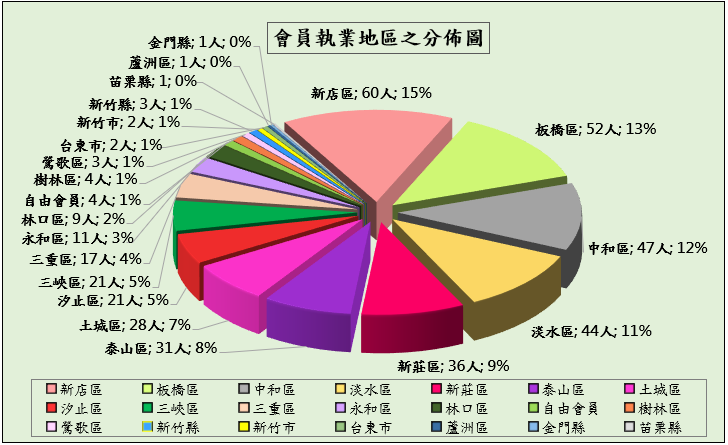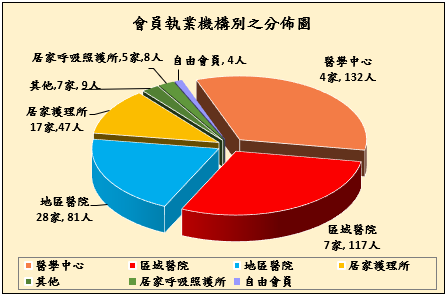 本會『新北市呼吸治療師公會』自成立以來,會員人數已由38人增加至目前398人(114年11月21日止),其中醫學中心132人佔33.17%;區域醫院117人佔29.40%;地區醫院81人佔20.35%;居家護理所47人佔11.81 %;以及居家呼吸照護所8人佔2.01%;其他地區9人,佔2.26%;自由會員4人,佔1.01%。其中以醫學中心所佔比例為較高,如圖一、圖二所示;